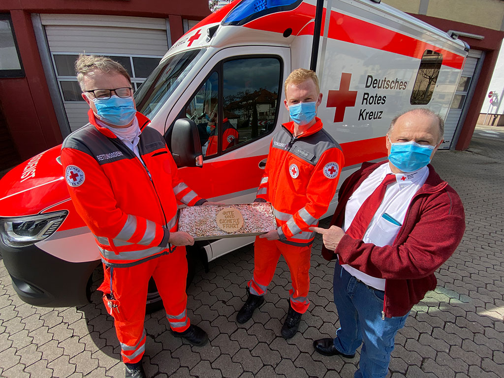 Mitte März übergab Daniela Finkensieper, Teamleiterin Rettungsdienst den Fahrzeugschlüssel in Heidelberg an den Standortbeauftragten Harald Bloos. Teamleiter Ronny Gill reichte in Wiesloch den Schlüssel an den Standortbeauftragten Rolf Wagner weiter. Zusätzlich überreichten die Teamleiter jeweils ein großes Blech leckeren Streuselkuchen. So gestärkt, ließ es sich für die Rettungsdienstmitarbeitenden in den neuen RTWs noch besser ausrücken.