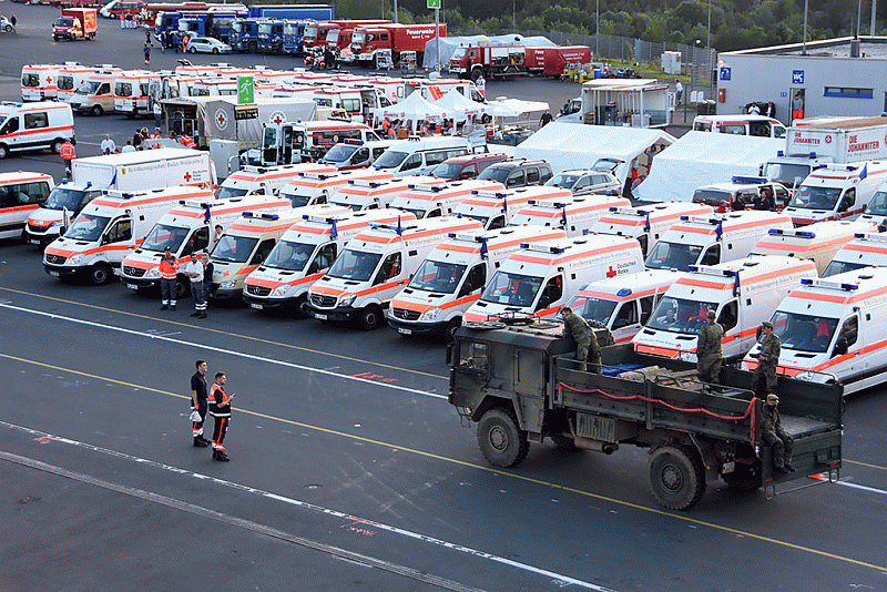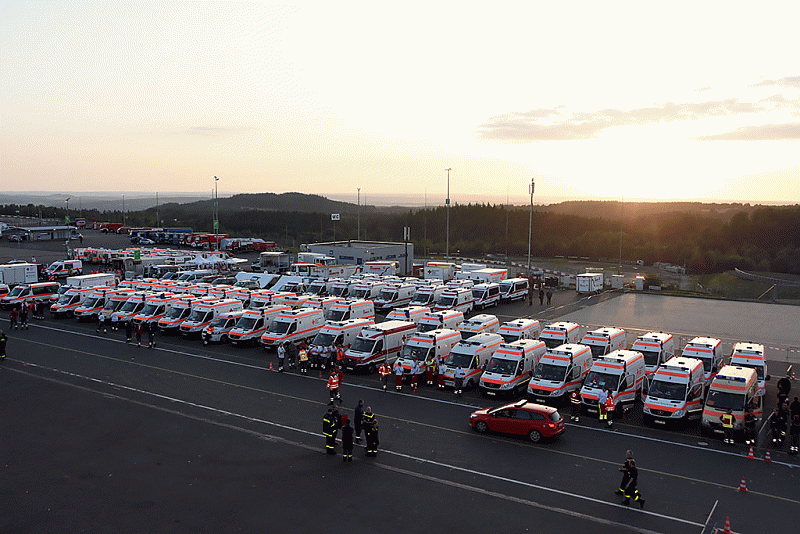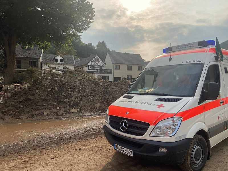 Die Bilder vom Bereitstellungsraum am Nürburgring sind beeindruckend: Hunderte Einsatzwagen von Rettungsdiensten, THW und Feuerwehr reihen sich neben schwerem Gerät der Bundeswehr auf. Einsatzleiter geben Funksprüche ab. Alle 15 Minuten startet ein Helikopter und bringt Frischwasser ins Katastrophengebiet. Tausende Rettungskräfte sammeln sich hier, um bei der schlimmsten Naturkatastrophe zu helfen, die Deutschland in den letzten Jahrzehnten getroffen hat. Auf dieses Szenario trafen auch ehrenamtliche Helferinnen und Helfer des DRK-Kreisverbandes Rhein-Neckar/Heidelberg.