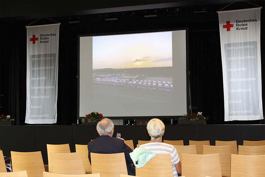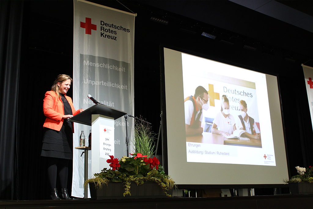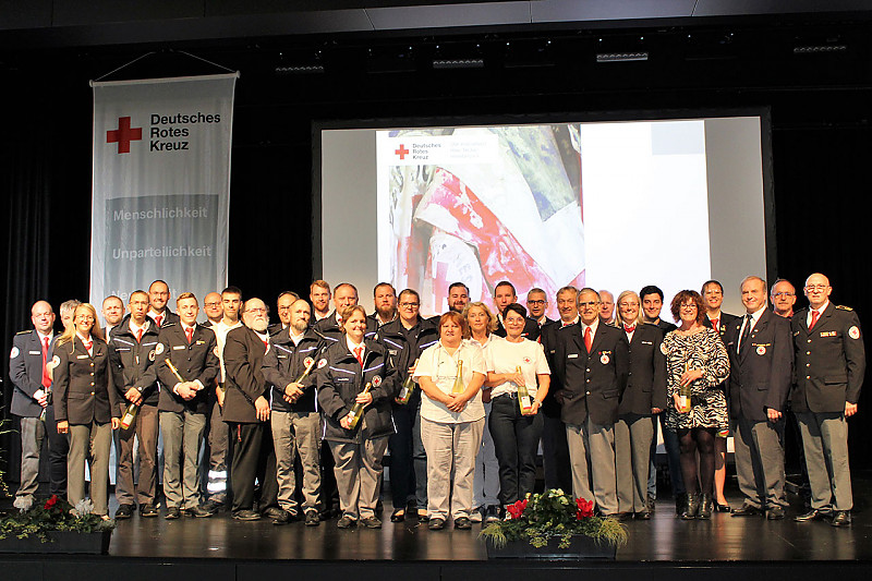 Andächtig und emotional wurde die Ehrung der Einsatzkräfte, die bei der Hochwasserkatastrophe 2021 im Ahrtal geholfen hatten. Die heftigen Eindrücke von dort waren noch sehr präsent – das Leid der Bevölkerung hatten fast alle Geehrten auf der Bühne hautnah miterlebt. Sie waren als Führungskräfte vor Ort, als Teil der Psychosozialen Notfallversorgung oder als Helfer beim Versorgungsplatz 10.000, wo die Flutgeschädigten mit warmen Mahlzeiten versorgt wurden. Dieses Engagement, für das sich nicht wenige Rotkreuzler extra Jahresurlaub nahmen, war außergewöhnlich und fand beim Ehrungsempfang endlich eine angemessene Würdigung.