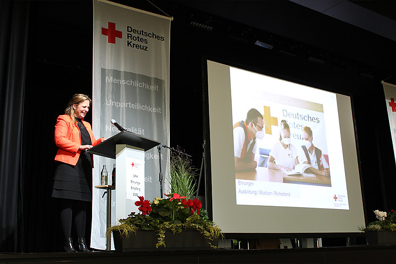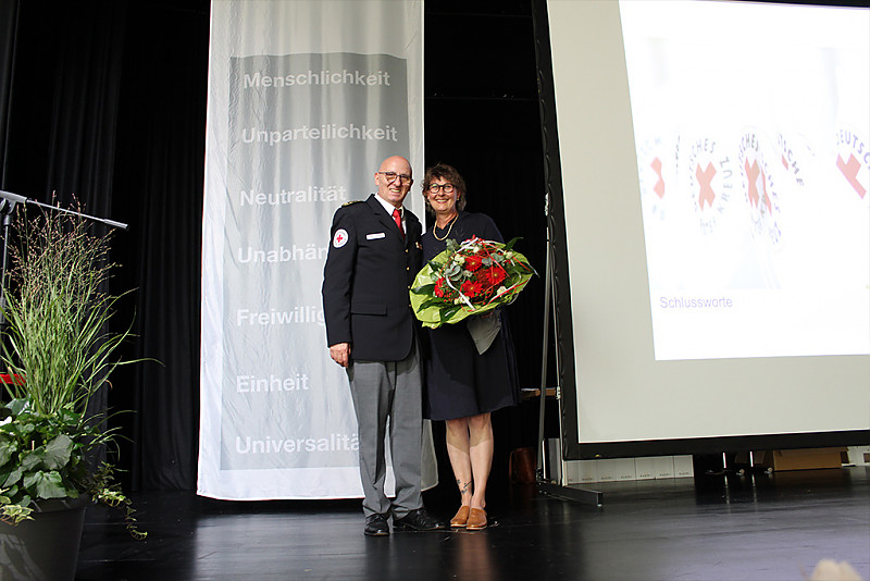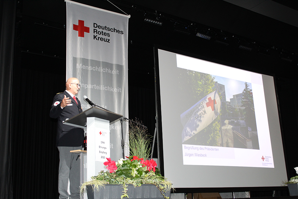 So nahmen die Einsätze während der Corona-Pandemie und bei der Hochwasserkatastrophe im Ahrtal viel Raum auf der großzügigen Bühne ein. DRK-Präsident Jürgen Wiesbeck verlas die Namen der zahlreichen Helfer, die sich in den Jahren 2020 und 2021 in Teststationen, in mobilen Impfteams, in den Impfzentren und bei der Qualifizierung von Corona-Schnelltestern verdient gemacht hatten. Er betonte, dass nicht etwa der Kreisverband, das Präsidium oder die Ortsvereinsvorsitzenden die Pandemie so erfolgreich bewältigt hätten – sondern „wir alle gemeinsam als Rotes Kreuz“. Auch DRK-Ehrenpräsident Dr. Eckart Würzner fand in seiner Videobotschaft viel lobende Worte für die Rotkreuzler. Diese hätten „maßgeblich dazu beigetragen, die Pandemie in Heidelberg und dem Rhein-Neckar-Kreis entscheidend einzudämmen“. Stellvertretend für alle Einsatzkräfte wurde der Einsatzstab des DRK-Kreisverbandes auf der Bühne geehrt. Dieser hatte bereits Anfang März 2020 die Arbeit aufgenommen und „kam in den turbulenten Zeiten zweimal täglich in Krisensitzungen zusammen“, wie Kreisbereitschaftsleiterin Yvonne Wiedl betonte.