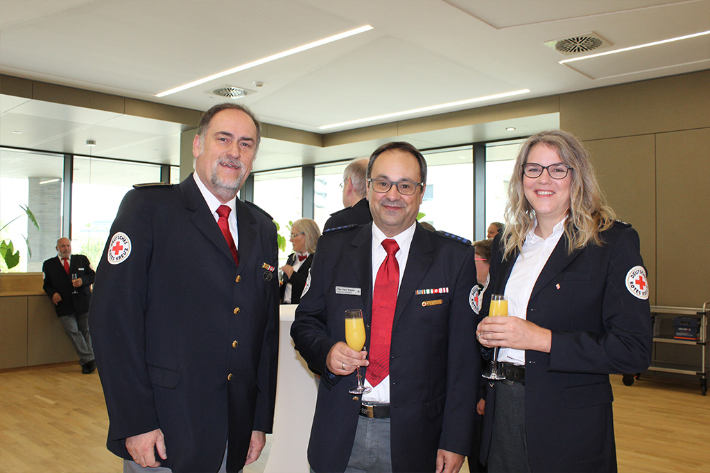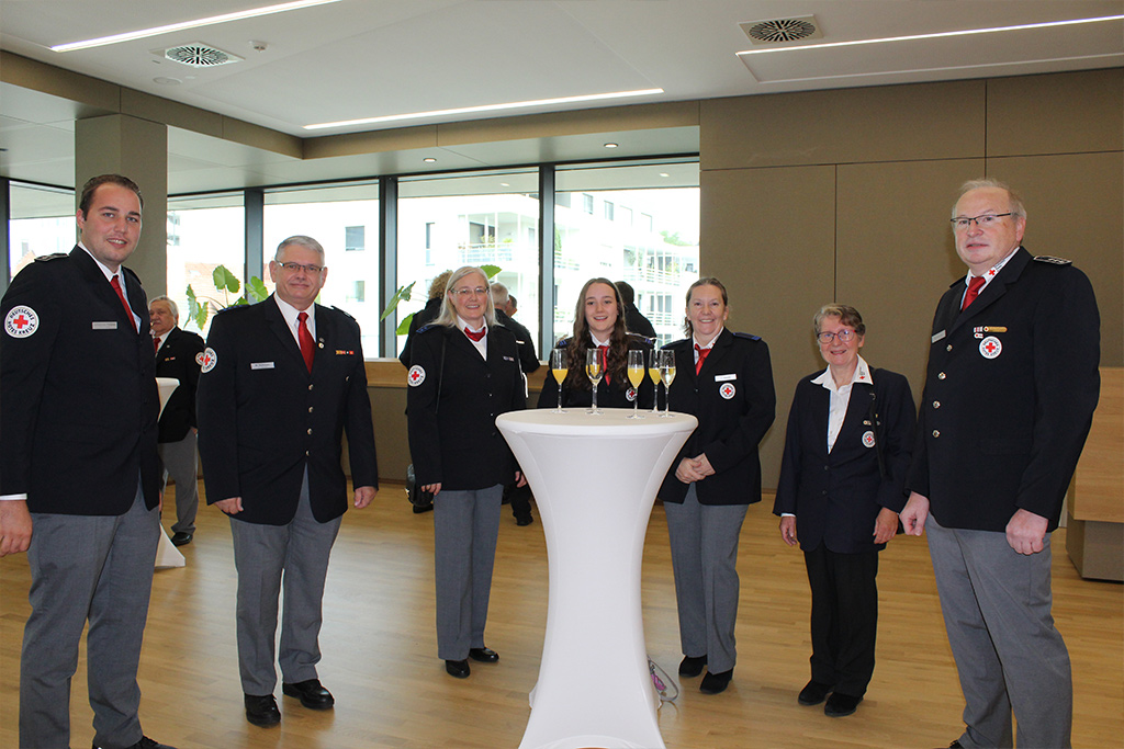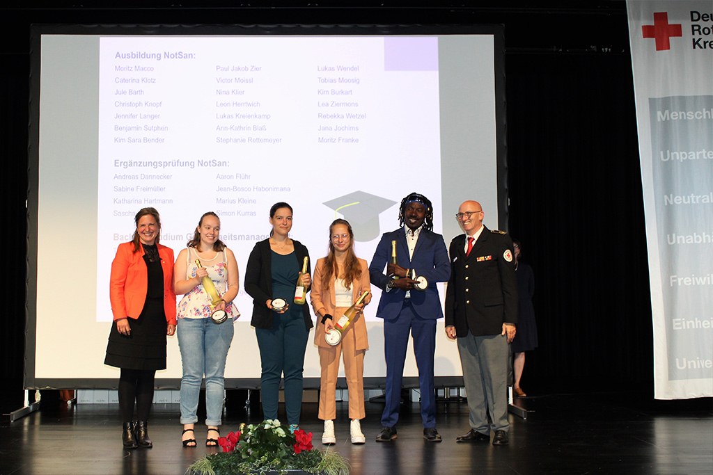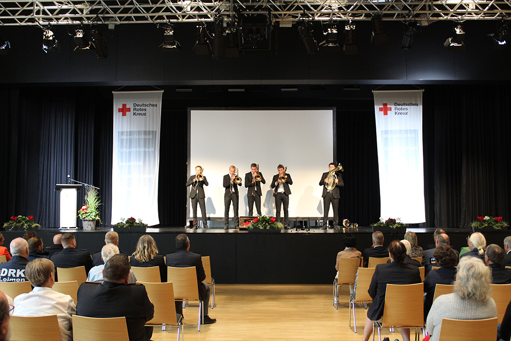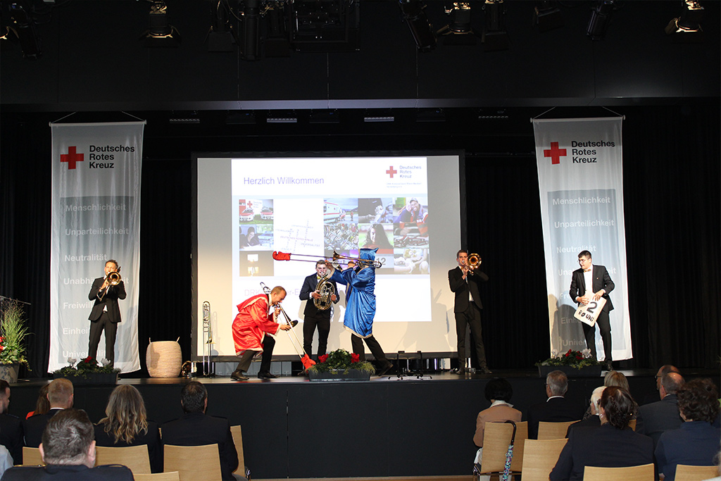 Ebenfalls auf der Bühne geehrt wurden die ehemaligen Absolventen und Auszubildenden, die sich mittlerweile Notfallsanitäter, Kauffrau für Büromanagement oder Bachelor im Gesundheitsmanagement nennen dürfen. Kreisgeschäftsführerin Caroline Falk würdigte die Beharrlichkeit und den Fleiß, den die Absolventen für diese Erfolge aufgebracht hatten. Die langjährigen Mitarbeiter Hans-Jürgen Florenz (Abteilung Soziale Dienste) und Rudolf Kern (Rettungsdienst) unterbrachen ihren wohlverdienten Ruhestand, um sich jetzt auch offiziell im verdienten Rahmen zu verabschieden. Caroline Falk bedankte sich herzlich für so viel jahrelange Treue und Einsatz. Ohne Pauken, aber mit vielen Trompeten beendeten die „3 and a half Thrombones“ den Ehrungsempfang – sie hatten mit ihren witzigen Darbietungen das Programm unterhaltsam aufgepeppt. Bei Fingerfood und Sekt stießen die Gäste auf ihre Ehrungen an – und darauf, endlich mal wieder gemeinsam feiern zu können.