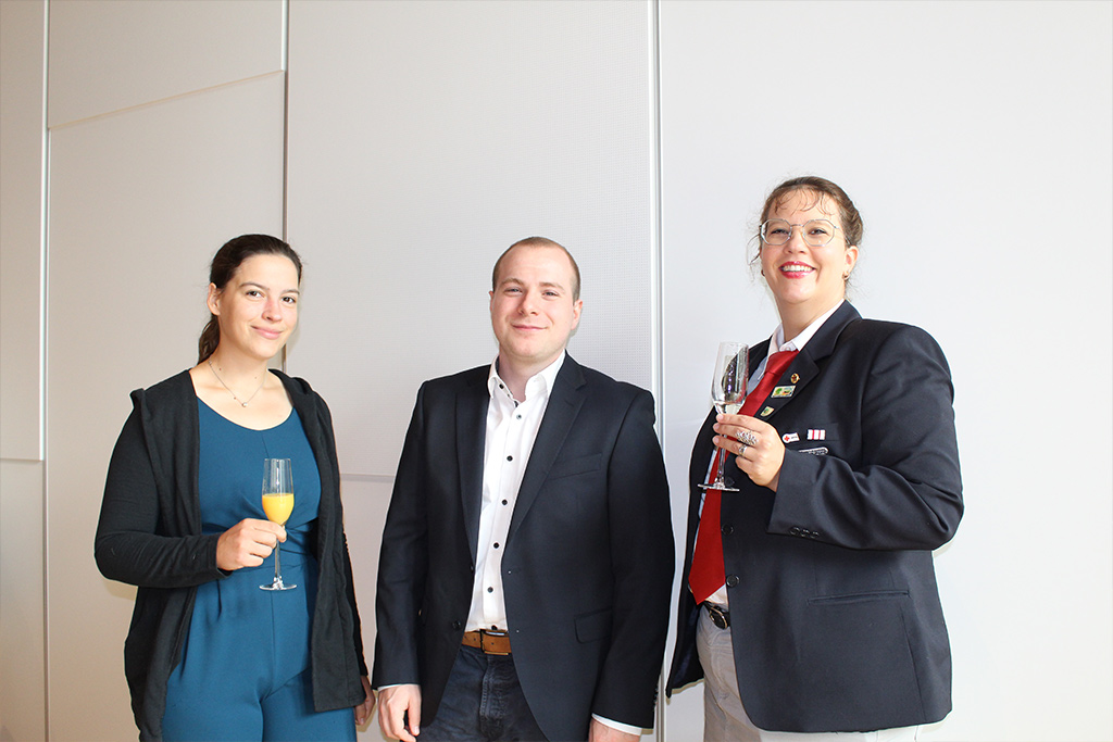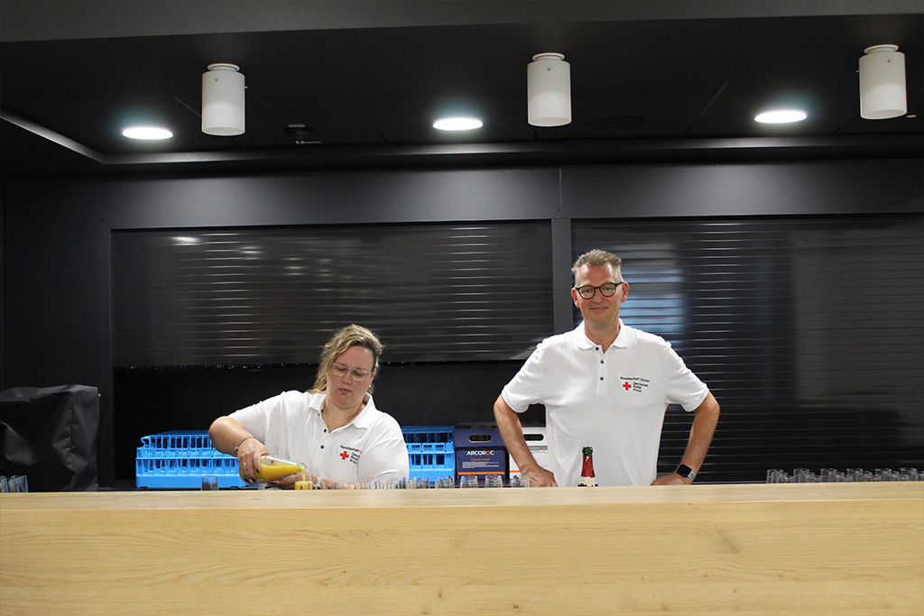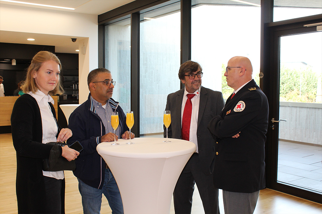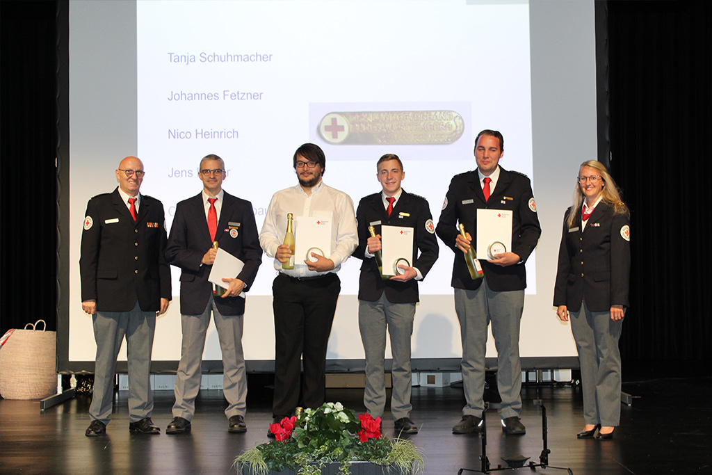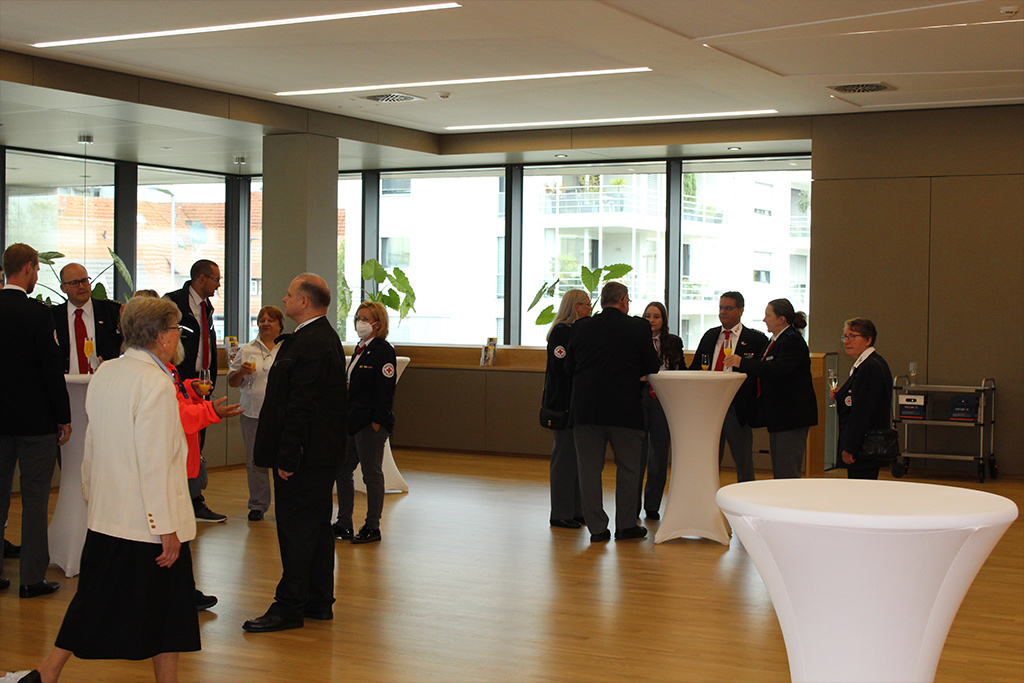 Ebenfalls auf der Bühne geehrt wurden die ehemaligen Absolventen und Auszubildenden, die sich mittlerweile Notfallsanitäter, Kauffrau für Büromanagement oder Bachelor im Gesundheitsmanagement nennen dürfen. Kreisgeschäftsführerin Caroline Falk würdigte die Beharrlichkeit und den Fleiß, den die Absolventen für diese Erfolge aufgebracht hatten. Die langjährigen Mitarbeiter Hans-Jürgen Florenz (Abteilung Soziale Dienste) und Rudolf Kern (Rettungsdienst) unterbrachen ihren wohlverdienten Ruhestand, um sich jetzt auch offiziell im verdienten Rahmen zu verabschieden. Caroline Falk bedankte sich herzlich für so viel jahrelange Treue und Einsatz. Ohne Pauken, aber mit vielen Trompeten beendeten die „3 and a half Thrombones“ den Ehrungsempfang – sie hatten mit ihren witzigen Darbietungen das Programm unterhaltsam aufgepeppt. Bei Fingerfood und Sekt stießen die Gäste auf ihre Ehrungen an – und darauf, endlich mal wieder gemeinsam feiern zu können.