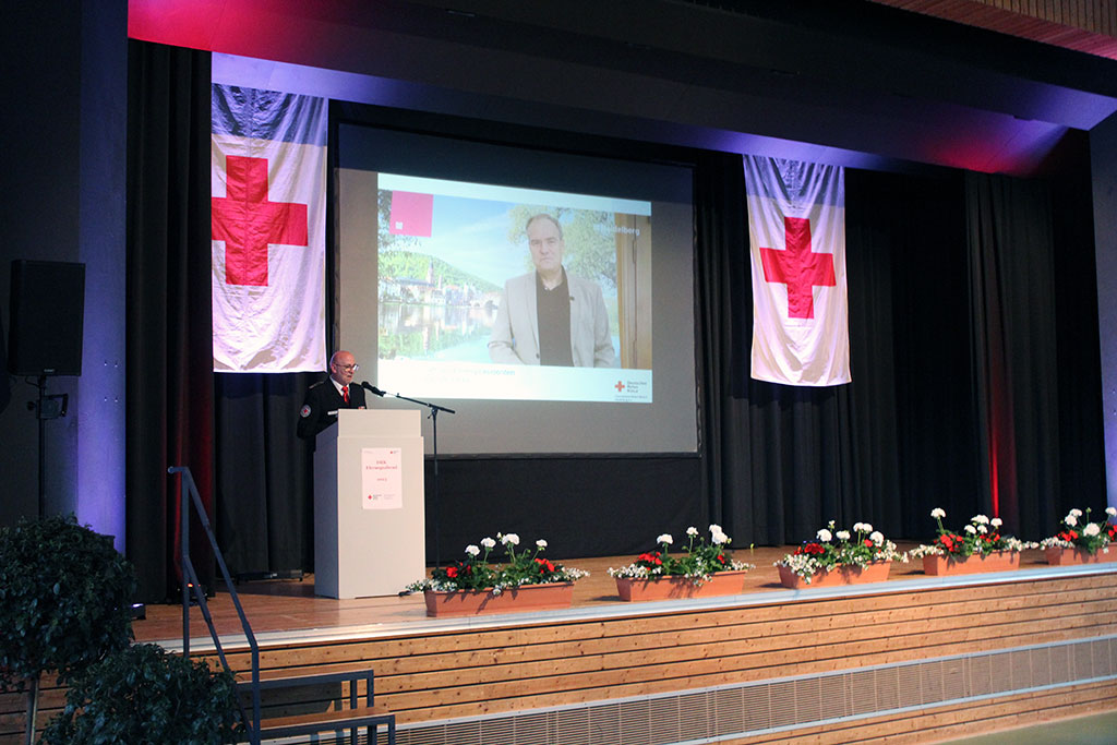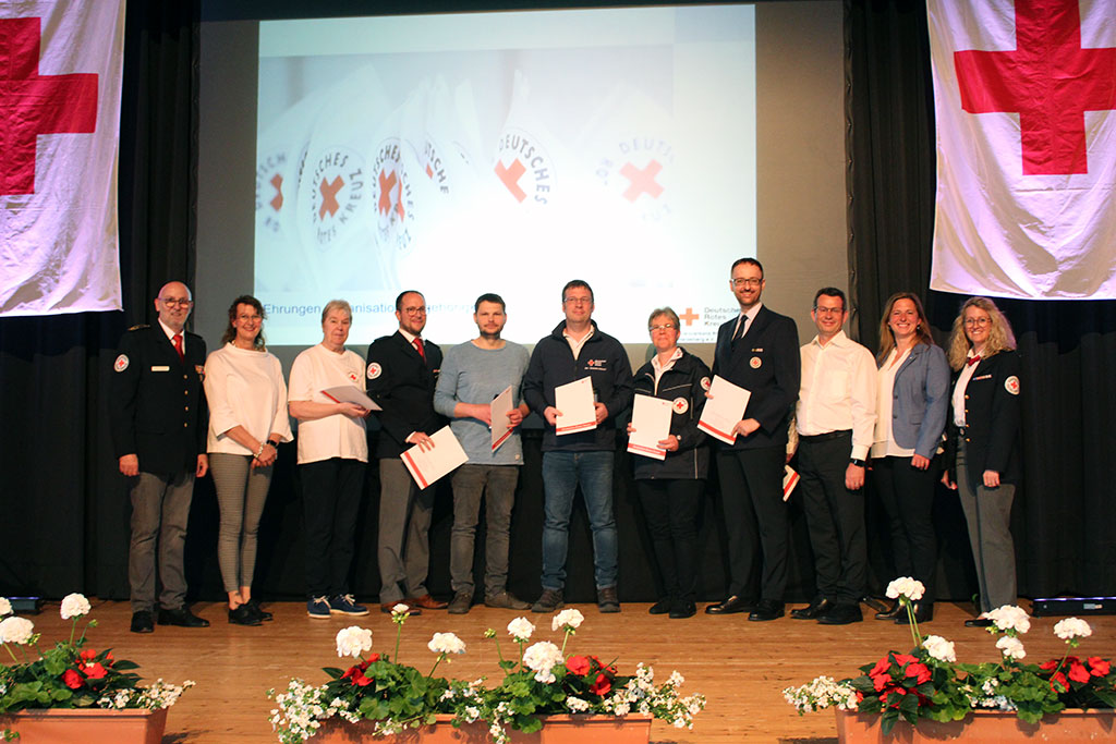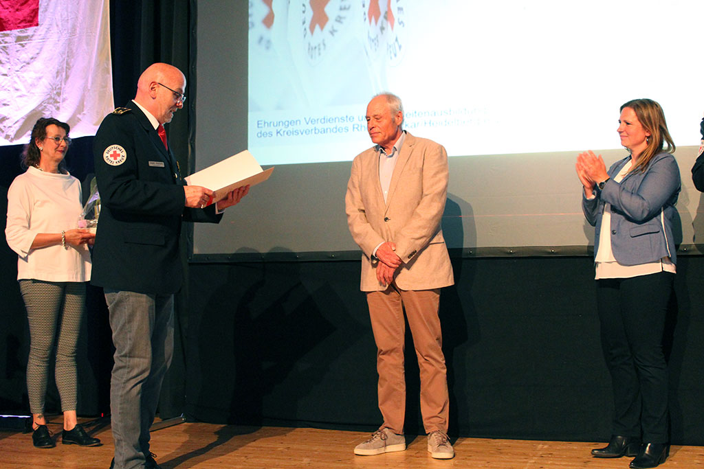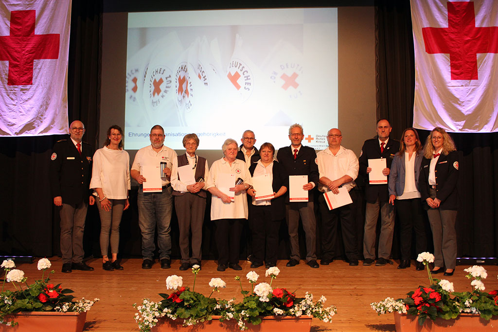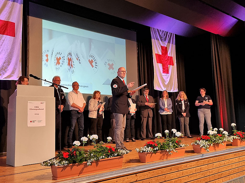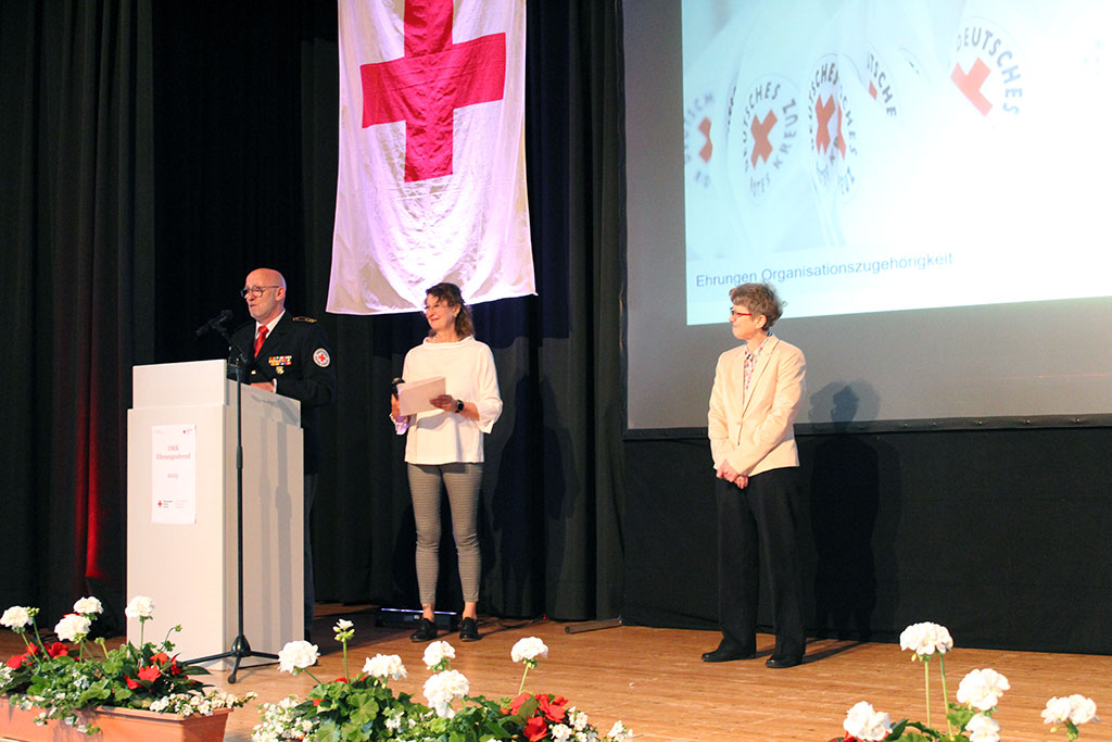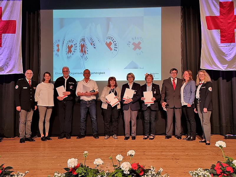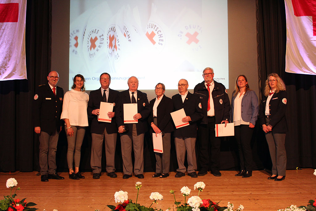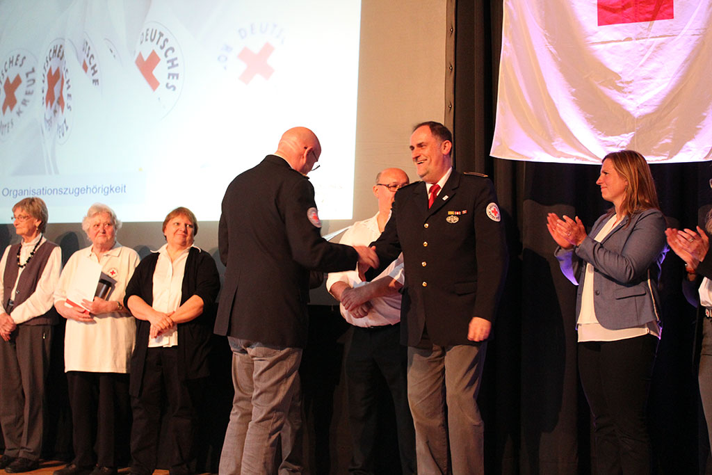 Wieviel Lebenszeit in der Arbeit unter dem Roten Kreuz insgesamt steckt, machte Präsident Jürgen Wiesbeck deutlich: „Wir könnten heute über 2.500 Jahre DRK-Engagement auf dieser Bühne ehren, wenn alle eingeladenen Geehrten heute anwesend wären. Wir können in unserem Kreisverband stolz darauf sein, eine so große Zahl an Menschen zu haben, die für andere Menschen da sind“.