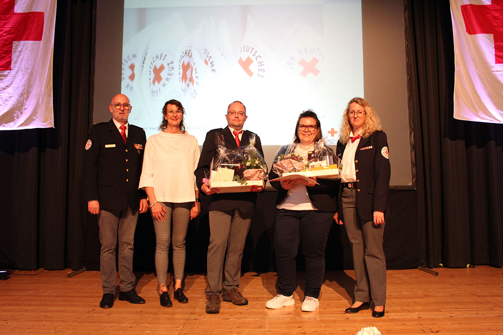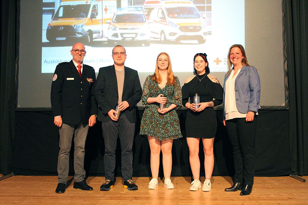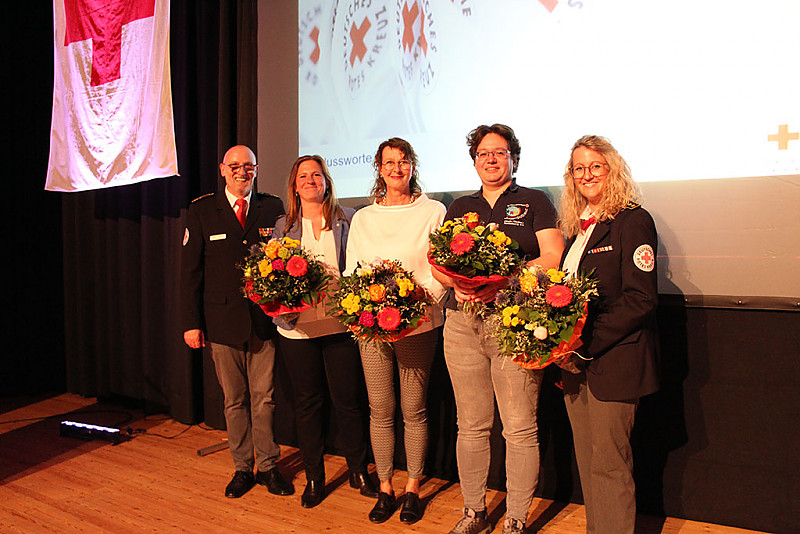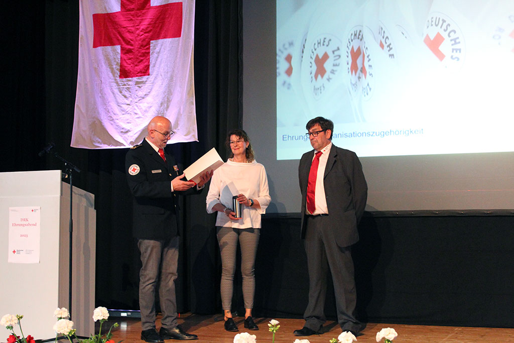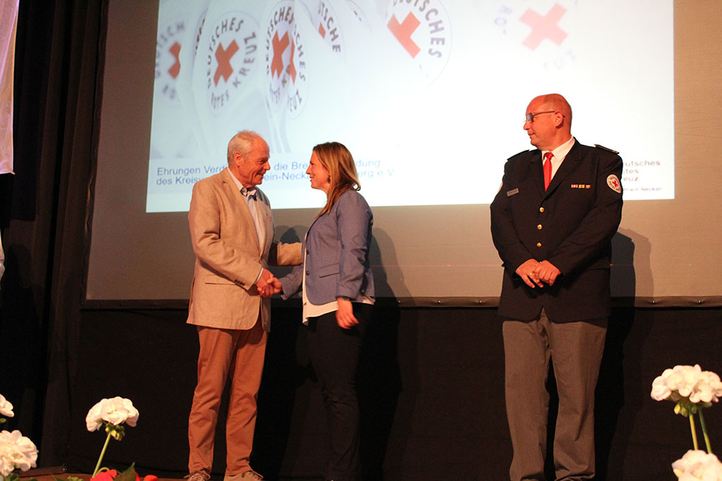 Alle drei beendeten im vergangenen September erfolgreich ihre Ausbildung zum Notfallsanitäter und zur Notfallsanitäterin. Ausbilder Elmar Wagner (und in Abwesenheit Dieter Odenwald und Robert Lang) erhielt eine Ehrung für seine langjährigen Verdienste in der Breitenausbildung. Jürgen Wiesbeck lobte in seiner Laudatio das Engagement der Ausbilder, „das weit über das normale Pensum hinausgeht, welches von einem EH-Ausbilder erwartet wird. Mit ihrer Verlässlichkeit und der überdurchschnittlich hohen Anzahl durchgeführter Lehrgänge setzen diese drei Ausbilder hohe Maßstäbe“, so der DRK-Präsident. Die Bedeutung der Ersten Hilfe für die Bevölkerung könne schließlich nicht hoch genug eingeschätzt werden.