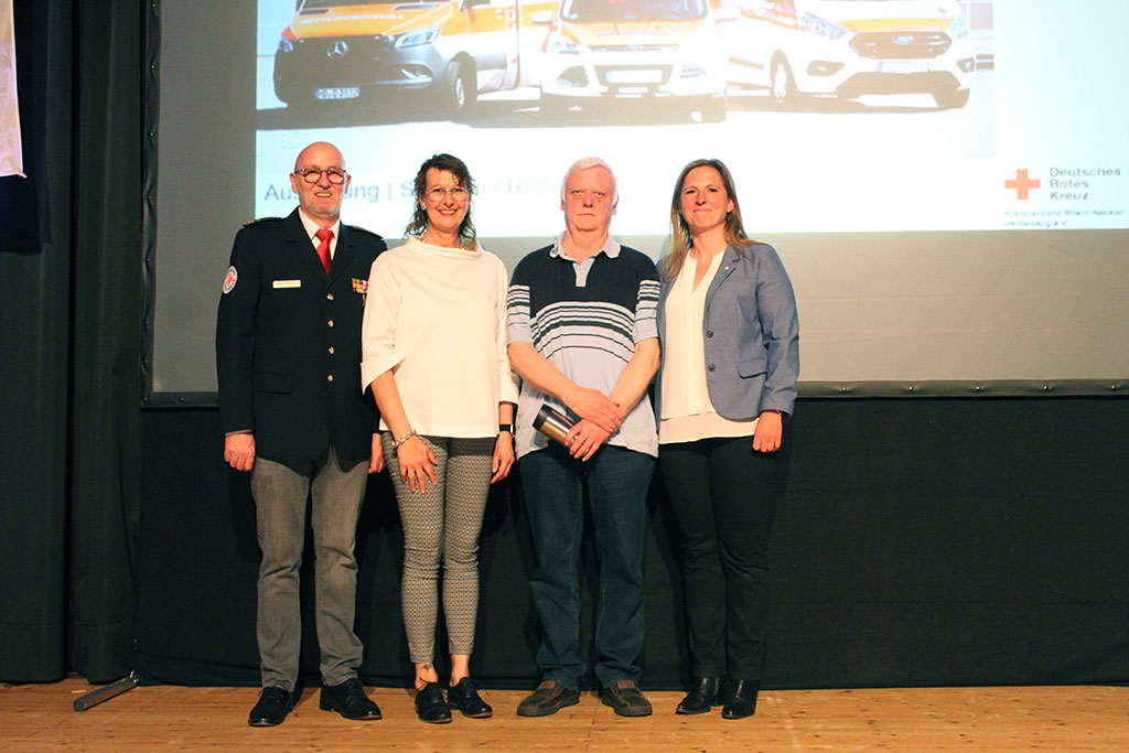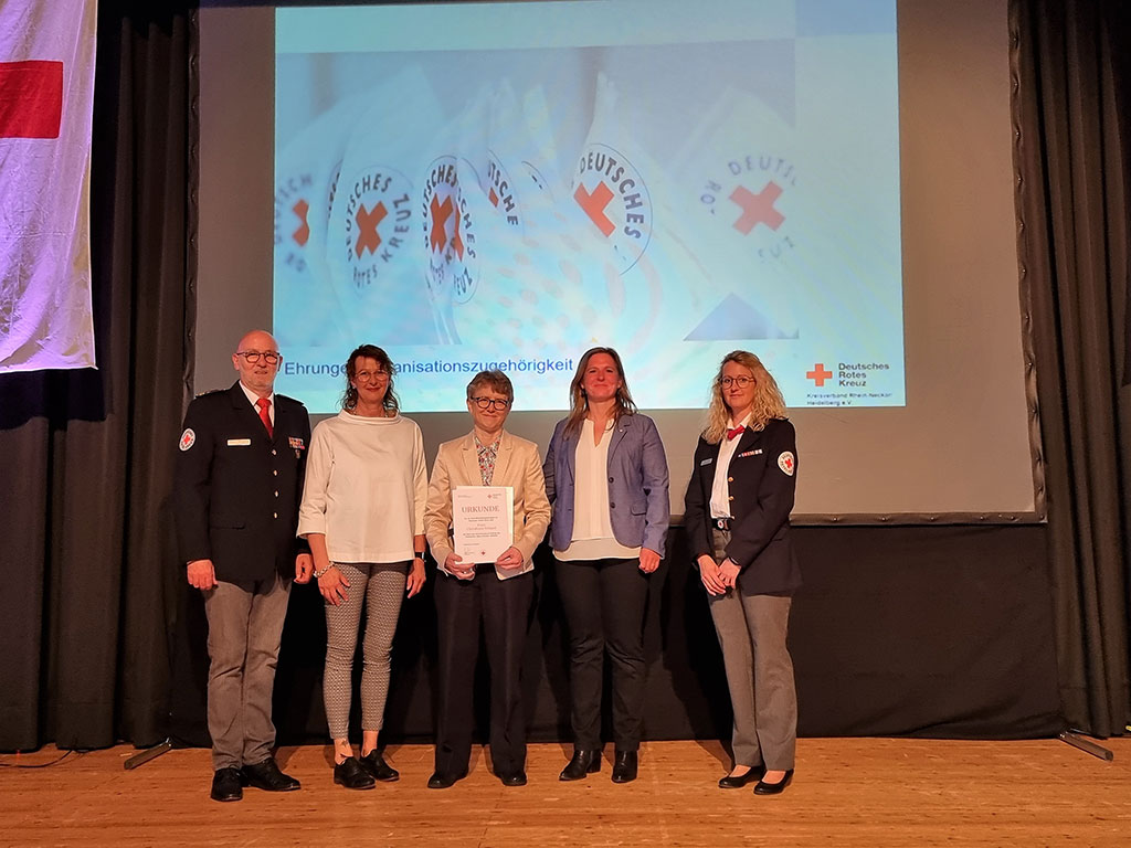 Geehrt wurden auch zahlreiche ehrenamtliche und hauptamtliche Mitglieder für ihre Organisationszugehörigkeit zwischen zehn und 60 Jahren. Im Ehrenamt waren es Wolfgang Kamuf vom Ortsverein St. Leon und Hugo Lang vom Ortsverein Sinsheim-Hilsbach, die mit jeweils 60 Jahren das längste ehrenamtliche Engagement aufweisen konnten. Im Hauptamt ehrte Kreisgeschäftsführerin Caroline Greiner ihre Mitarbeiterin Christiane Ehrhard, die seit sage und schreibe 45 Jahren im DRK-Kreisverband Rhein-Neckar/Heidelberg tätig ist. Seit Beginn ihrer Ausbildung ist sie dem DRK treu geblieben und wurde deshalb zurecht mit großem Applaus auf der Bühne begrüßt. Rentner Udo Schmidt wurde für viele Jahre verlässliche Arbeit im Rettungsdienst des Kreisverbandes geehrt. Der allseits beliebte Kollege trat am 1. April 1979 in den Kreisverband ein und genießt seit Anfang dieses Jahres seinen Ruhestand.
