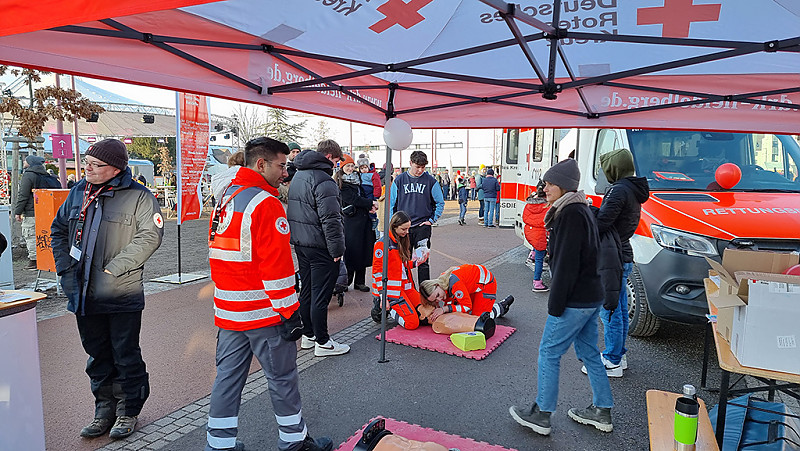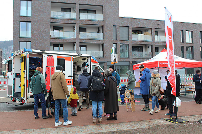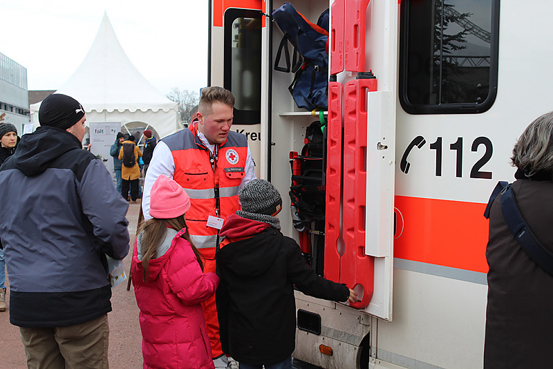 Die Hauptattraktion war aber der weithin sichtbare Rettungswagen. Vor dessen Seitentür bildeten sich immer wieder lange Schlangen. Vor allem Kinder und Jugendliche wollten unbedingt das Innenleben und die Ausstattung eines Rettungswagens kennenlernen. Unsere Notfallsanitäter-Auszubildenden trotzten den eisigen Temperaturen und erklärten geduldig Trage, EKG, Notfallrucksäcke und all die anderen Ausstattungsmerkmale, mit denen sie im Notfall anrücken. Aber auch zu den Inhalten ihrer Ausbildung wurden sie gefragt, und einmal mehr wurde deutlich, dass sich viele junge Menschen für diesen herausfordernden Beruf begeistern lassen.