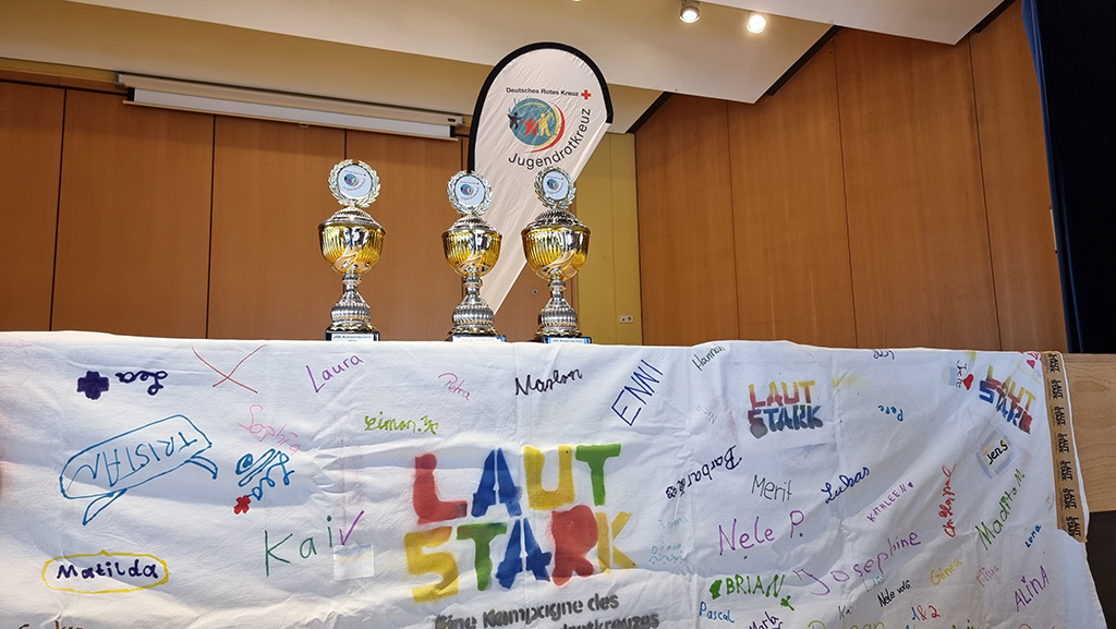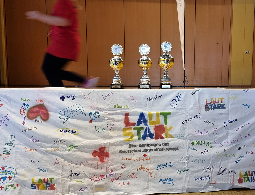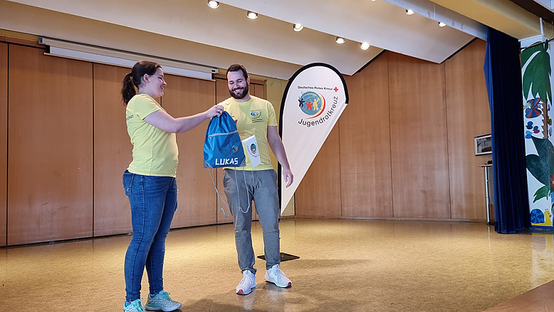 Bevor es am Nachmittag an die Siegerehrung ging, überreichte die stellvertretende Kreisjugendleiterin Stephanie Rettemeyer dem auf der Kreisversammlung neugewählten Kreisjugendleiter Lukas Jäger einen JRK-Turnbeutel mit seinem Namen drauf. Das gesamte Leitungsteam mit seinen Helferinnen und Helfern hatte die erste große Veranstaltung unter ihrer Führung erfolgreich bewältigt. „Es lief alles reibungslos. Es war das erste Mal, dass wir in dieser Konstellation eine größere Veranstaltung geplant und geleitet haben, wir sind also sehr zufrieden“, zog Stephanie Rettemeyer ein positives Fazit.