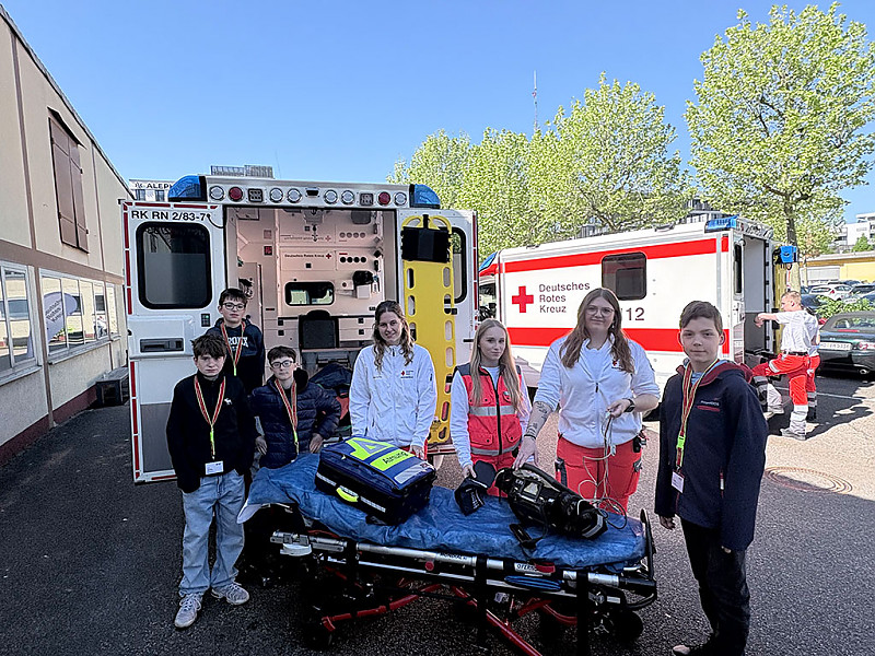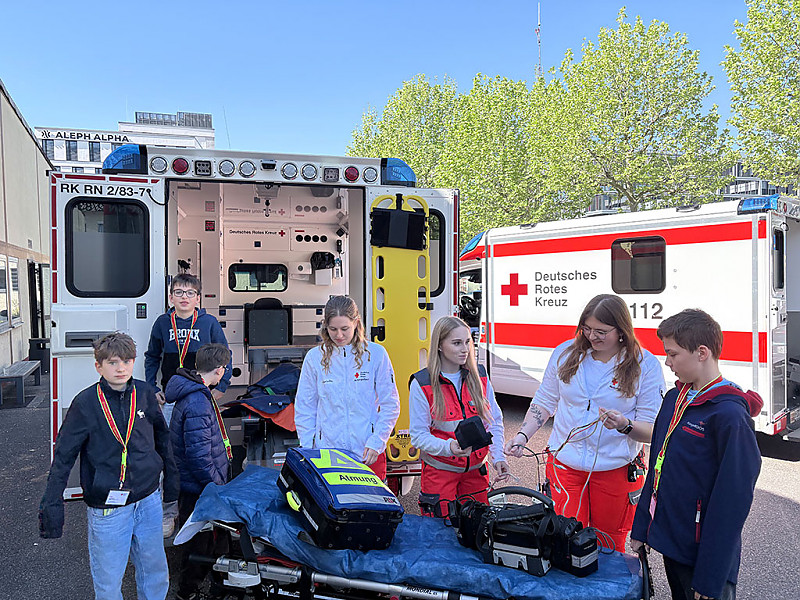 Bei strahlendem Sonnenschein haben wir am Vormittag zunächst die Boys begrüßt, mit Namensschildern ausgestattet und in zwei Gruppen aufgeteilt. Eine Gruppe konnte draußen direkt einen Rettungswagen erkunden und bekam von DRK-Mitarbeiter*innen jede Menge Infos zum Beruf Notfallsanitäter sowie eine Demonstration der medizinischen Geräte, die im Notfall zum Einsatz kommen. Für die Jungs der anderen Gruppe ging es in unseren Schulungsräumen an die Praxis. Unter der Leitung von Ausbilder*innen der Rotkreuzdienste und des Rettungsdienstes wurden Druckverbände angelegt, die stabile Seitenlage geübt, Pflaster geklebt...